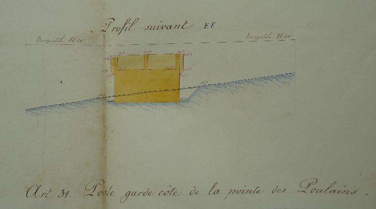Au point d'intersection de la côte exposée à l'E.N.E., avec la portion du littoral qui regarde l'O., s'avance dans la mer un promontoire que l'on nomme la pointe des Poulains. Sur la gauche de ce cap s'étend une plage de sable, dont l'entrée est difficile ; mais qui mérite cependant d'être surveillée, parcequ'elle est assez plate et assez large. La batterie de la pointe des Poulains n'est pas destinée à cet objet. Elle se compose de deux batteries peu éloignées l'une de l'autre ; la 1re située au point le plus saillant du promontoire, la 2e en arrière sur la partie élevée du plateau. Ces deux ouvrages n'auraient d'autre but que d'offrir la protection de leur canon aux bâtiments venant de l'O. Mais les récifs qui entourent la pointe des Poulains, s'étendant dans certaines directions jusqu'à 1800 mètres en mer, cette protection ne pouvait être que fort lointaine et par conséquent, inefficace. En conséquence, la Commission propose de supprimer les deux batteries de la pointe des Poulains ; mais comme les plages de débarquement de cette presqu'île, pourraient offrir aux entreprises de l'ennemi les avantages dont il a été question à l'occasion du Vieux Château, la Commission place un poste garde-côtes, corps de garde défensif n° 2, sur l'isthme du rocher qui sépare les deux petites plages de débarquement.