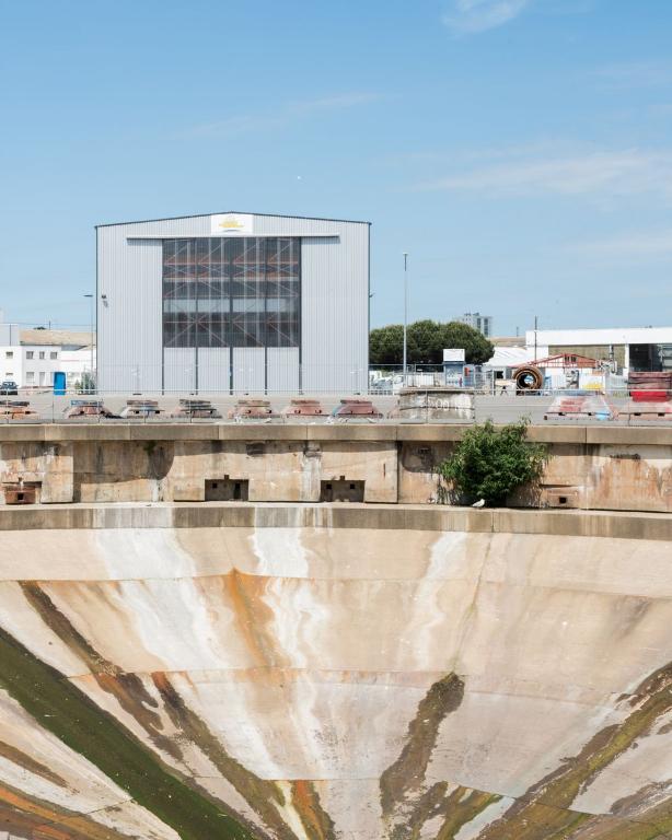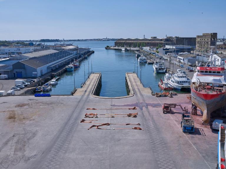 La fosse du pont basculant et tournant du slipway a été reconvertie en bassin de décantation pour le terre-plein de l’aire de réparation navale.