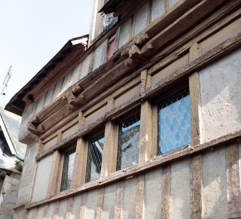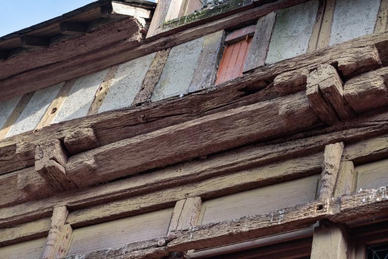 Façade principale en pan de bois : l'étage et le surcroît sont construits en encorbellement avec entretoises, encadré par deux murs à ressauts. Des pilastres en pierre témoignent d'une reprise du rez-de-chaussée et structurent les ouvertures avec une fenêtre à étal de chaque côté de la porte centrale. La sablière de plancher est retournée : les assemblages en queue d'aronde sont visibles. Ils servaient auparavant à bloquer les solives. Les entretoises sont simplement chanfreinées avec congés.