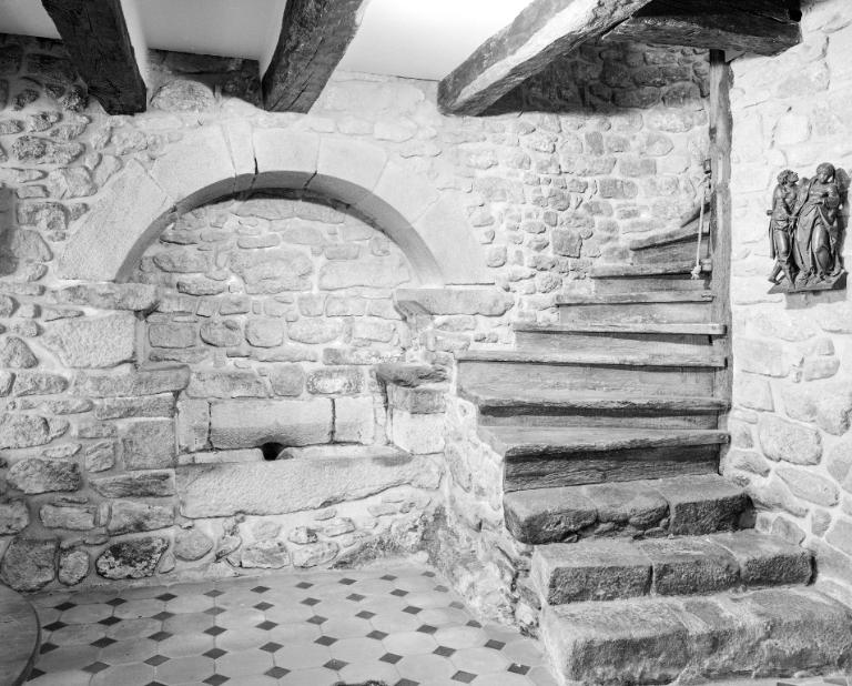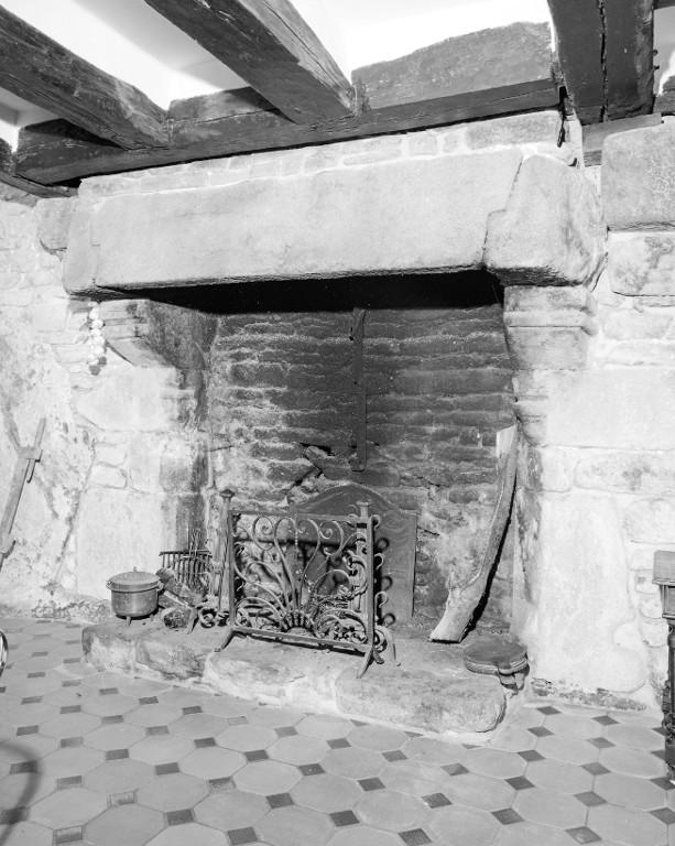 Des parquets ornementaux postérieurs habillent le rez-de-chaussée. Un vaisselier et une cheminée apportent du confort. L'escalier en vis donne accès aux étages. Une œuvre en céramique contemporaine occupe le fond de la cheminée du premier étage.