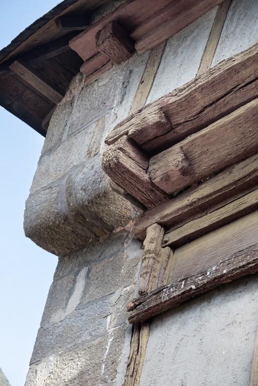 Typologiesmaison d'angle à 1 façade de pierre ; mur pignon en façade principale ; 2 encorbellements ; surcroît ; croupe