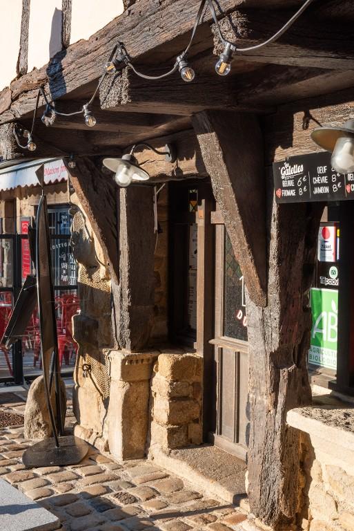 Quatre poteaux divisent le rez-de-chaussée commercial en trois ouvertures, une porte et deux vitrines. Les étals maçonnés sont de facture récente. Ces poteaux reçoivent la sablière de plancher, sur laquelle reposent les solives qui forment un encorbellement très profond. Des consoles renforcent l'assemblage entre les poteaux et les solives principales. L'espace créé par l'encorbellement est comblé par deux entretoises, simples pièces de bois quadrangulaires disposées en escalier. Le contreventement de l'étage se compose de poteaux et d'une croix de Saint-André à droite sur toute la hauteur du niveau. Six petites fenêtres sont dessinées par un appui et un linteau filant, donc cinq sont ouvertes. L'encorbellement des combles, avec entretoises, est peu profond.