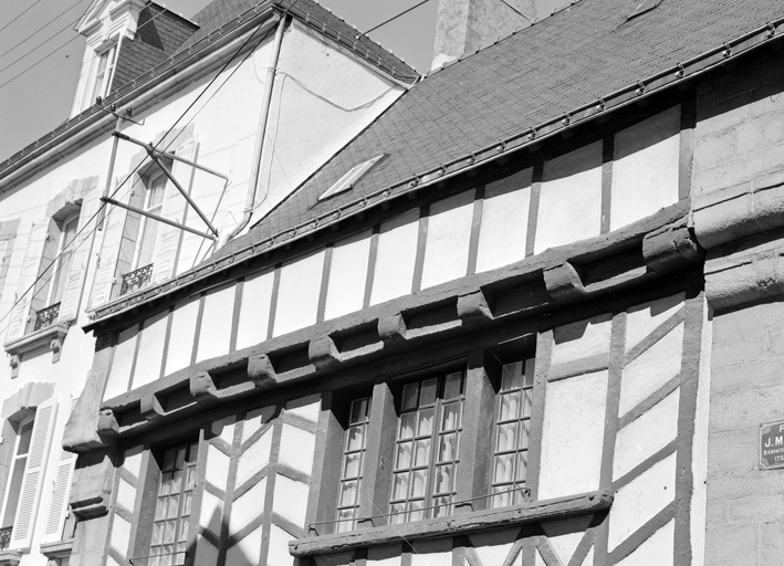 La façade à gouttereau sur rue présente un premier étage et un surcroît en pan de bois en encorbellement ancrés dans des murs pignons à ressauts. Une lisse basse souligne l’appui de la galerie de fenêtres. Chevrons, potelets et croix de Saint-André contreventent et animent la façade. Le rez-de-chaussée est en partie repris et reculé par rapport à l'aplomb initial. Le pignon donnant sur la rue de Keriolet comporte un conduit de cheminée et une ouverture bouchée, probablement un ancien soupirail.