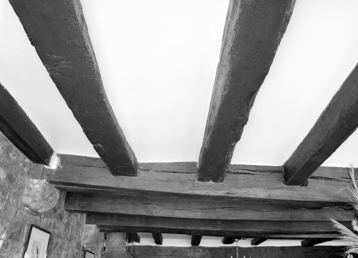 Typologiesmaison d'angle à 1 façade de pierre ; mur pignon en façade principale ; 2 encorbellements ; escalier de bois à balustres carrés