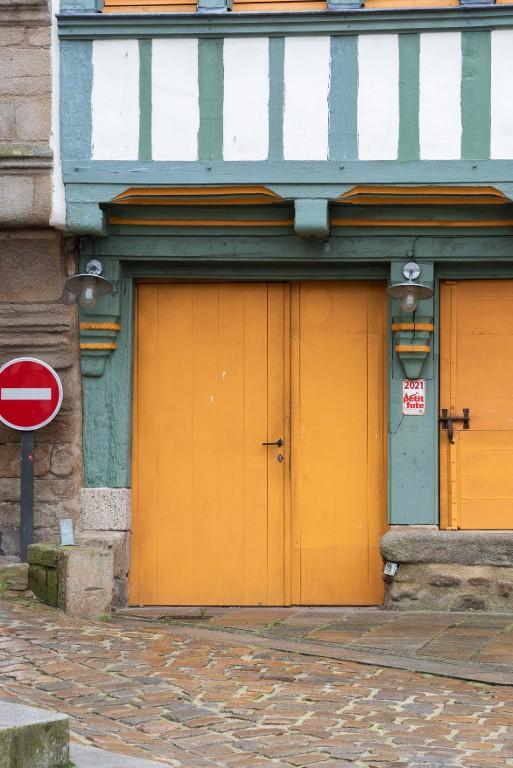 La jonction entre les deux façades en pan de bois place Saint-Sauveur est assurée par une croix de Saint-André au premier étage et le prolongement des sablières et entretoises du n°21 qui font la liaison structurelle et visuelle au niveau des encorbellements.