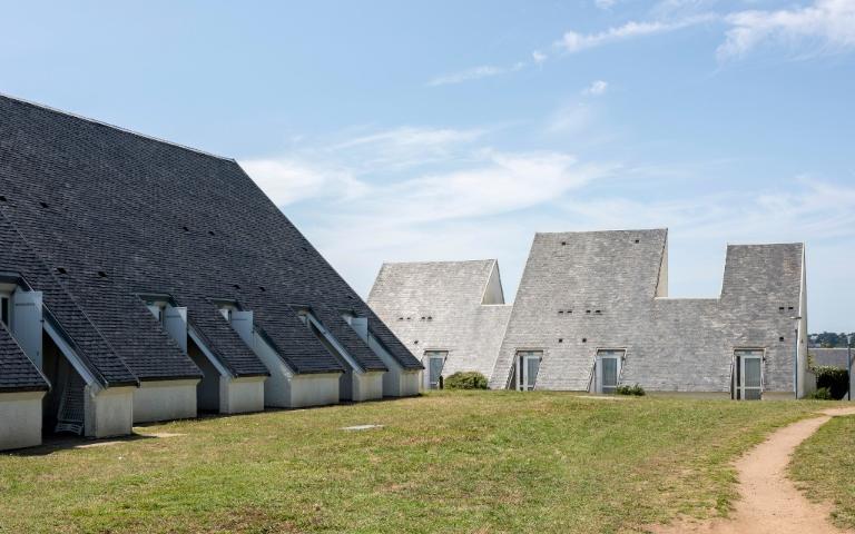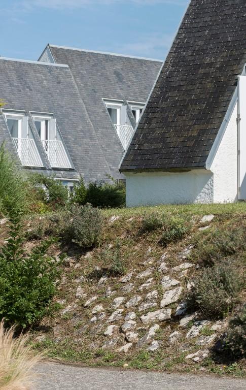 L’unique volume pyramidal, qui singularise le pavillon d’accueil (aujourd’hui transformé en bar), se détache du reste des bâtiments collectifs et résidentiels. Cette attention portée au contexte breton, naturel comme bâti, se traduit par l’emploi de matériaux traditionnels (bois, ardoise) et par le choix de volumes simples et épurés. Dans la cour et les bâtiments collectifs, les dalles d'ardoise qui pavent le sol prolongent visuellement les espaces et atténuent la frontière entre intérieurs et extérieurs. Gomis conjugue ainsi inspiration vernaculaire et modernité, produisant une architecture calme, mesurée et d’une grande sobriété.