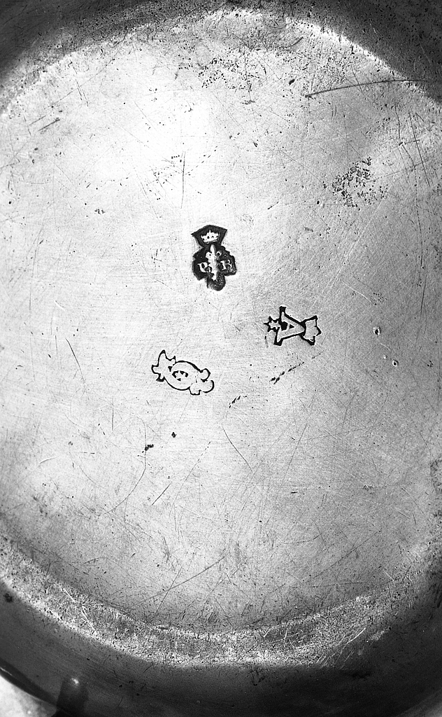 Poinçon de maître : P B séparés par une Hermine, Fleur de lys couronne dessus ; poinçon de charge : 9 fleuronné, Hermine ; lettre-date : à Couronne, Hermine dessous.