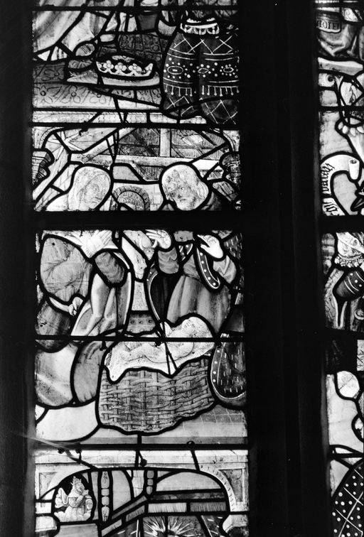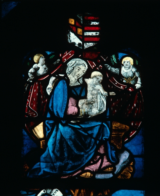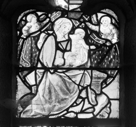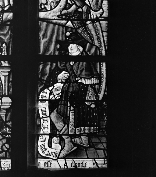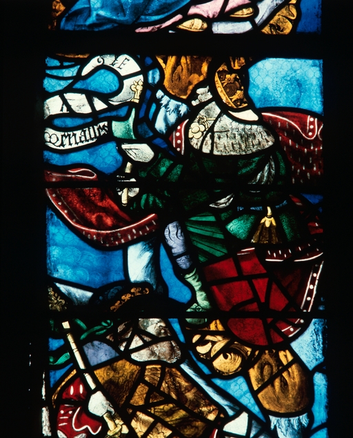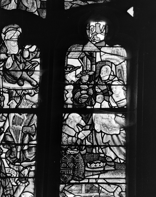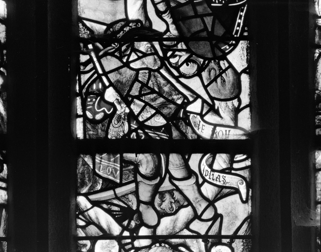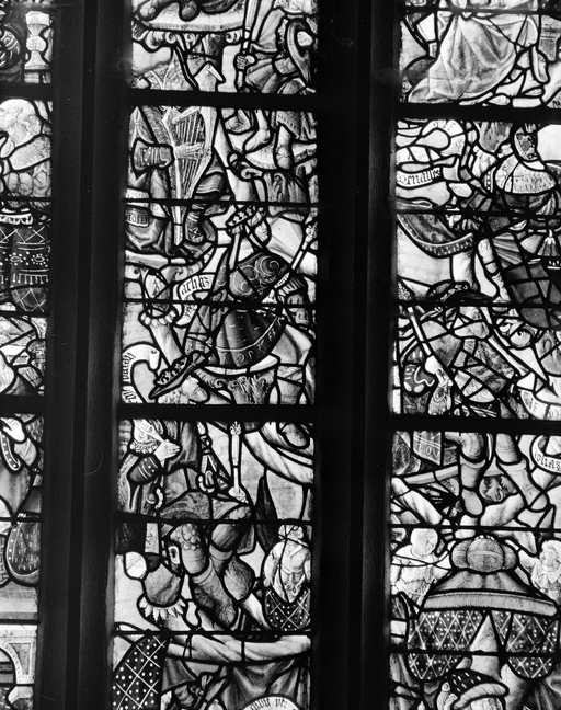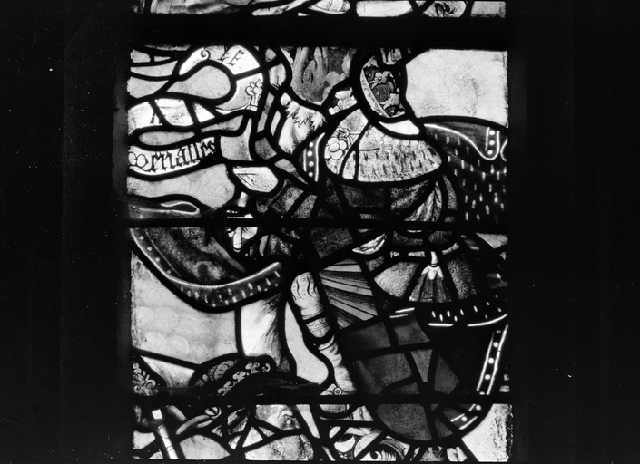 Compléments modernes dans la partie supérieure du panneau 4d, tympan moderne réutilisant quelques verres anciens ; panneau 3d tronqué à droite, inscription à la base de la verrière, en partie disparue.