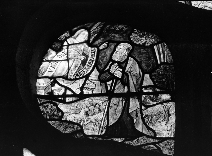 Inscription peinte panneau 1a : AVE GR. PLENA DN SPVS SCT VENIET, ECCE ANCILLA DMI FIAT.. ; inscription peinte panneau 3a : vos ESTIS EV MO ; inscription gravée panneaux 1b et 2b : PROFET ; inscription peinte panneaux 1b et 2b : VOS VOS EST LAU VIRGA ESS.
