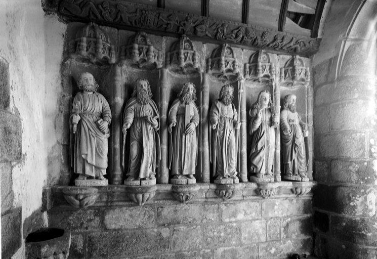 Inscription sur socles : S.SIMON, S.MATHIAS, S.BARTOLOMEUS, S.PHILIPPVS, S.IACOBVS MINOR, S.MATHAEUS, S.PAULVS, S.ANDREAS, S.IACOBUS (M) AIOR, S.IOANNES, S.THOMAS, S.PETRVS FAICT AN 1582 FABRIQUE HENRI LE GUIADER.