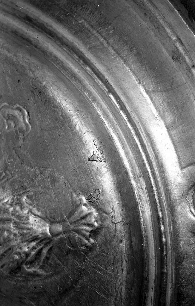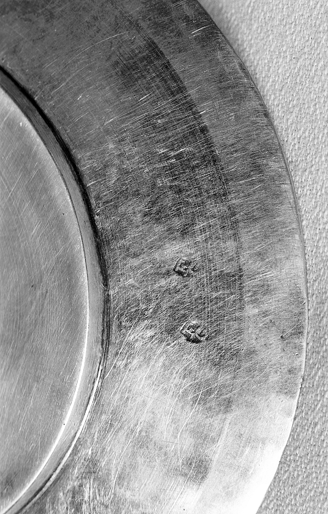 Poinçons de chargé : A fleuronné et couronné ; A dans un cercle avec quadrillé, chiffre 2 ; poinçons de décharge : feuille de chêne ; une mouche ; lettre-date : P fleuronné surmonté d'une couronne fermée, chiffre 88, astérisque ; poinçons de maître : J et.