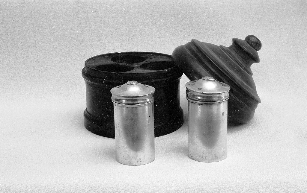 Coffret en forme de cylindre plat percé de trois alvéoles contenant des ampoules cylindriques avec couvercle. Coffret en bois.
