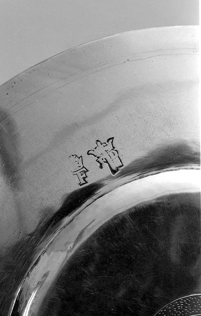 Poinçons sous le marli ; lettre-date : lettre F couronnée (Angers vers 1656) ; poinçon de maître : poinçon non identifié : lettres F et D, une clé au milieu, une couronne au dessus.
