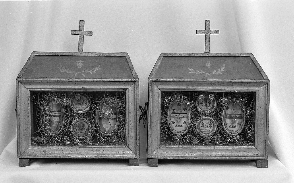 Boîte avec une vitrine rectangulaire et surmontée d'une petite croix. Assemblages par tenons et mortaises et colles ; papiers roulés.