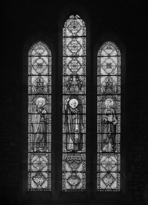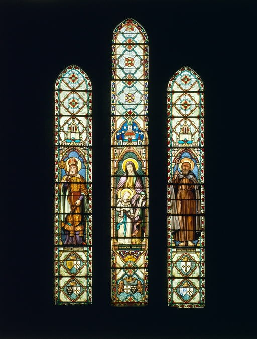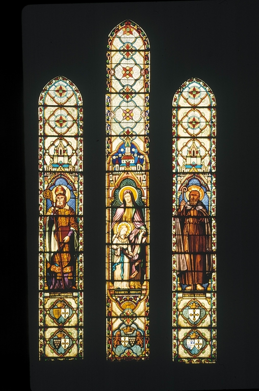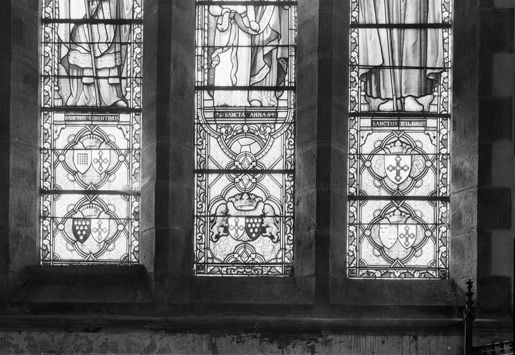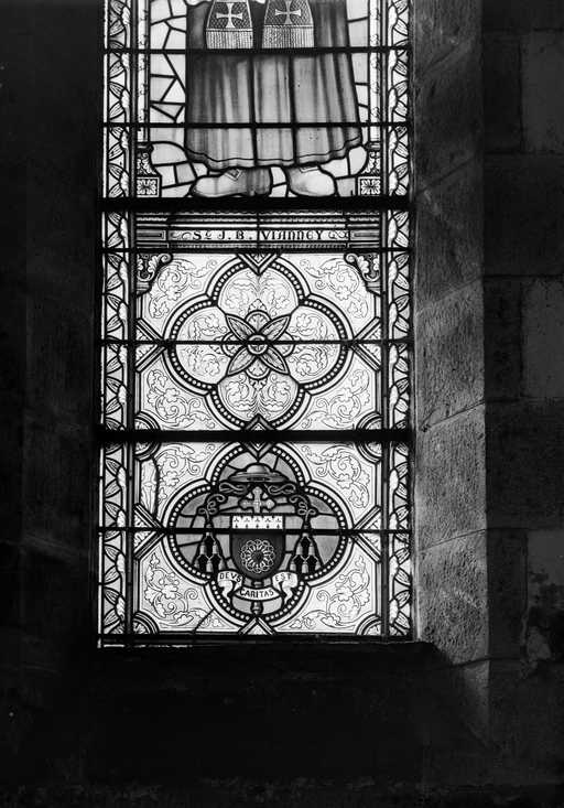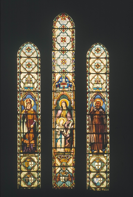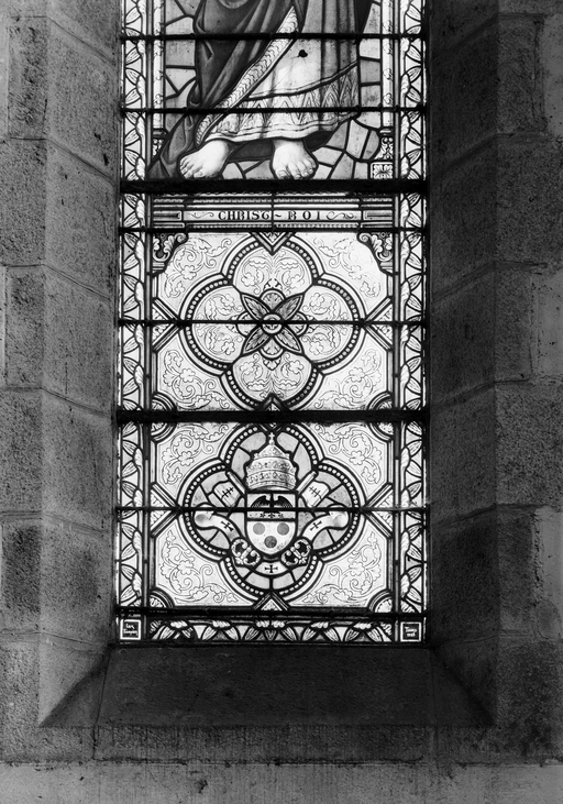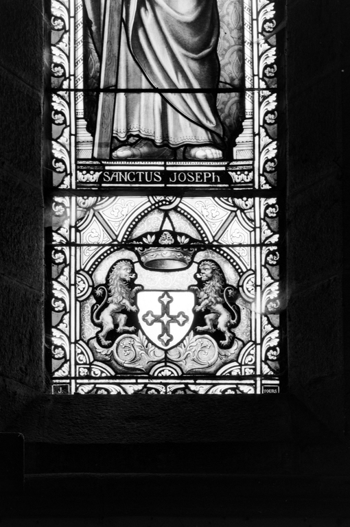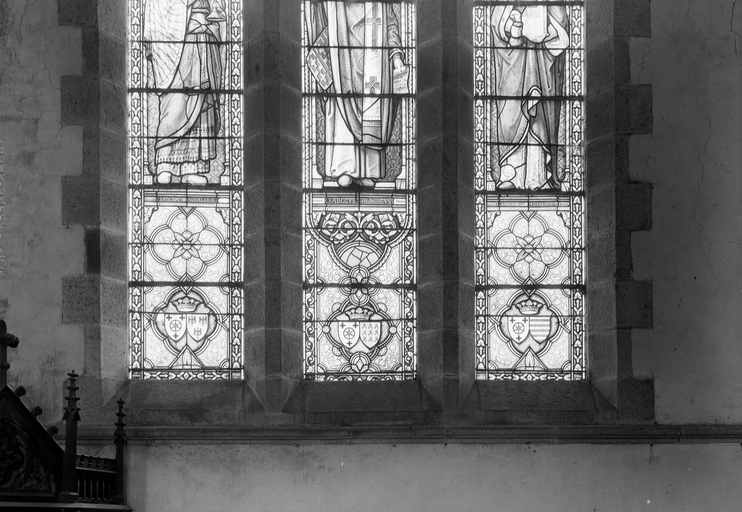 Ensemble hétérogène de huit verrières ; les six verrières à personnage furent exécutées par l'atelier J. Puis Lux Fournier de Tours en 1889 ; les deux verrières figurées furent exécutées par l'atelier G. Léglise de Paris en 1923.