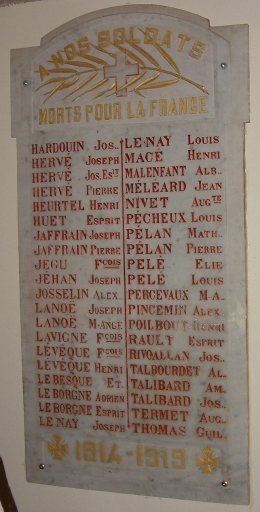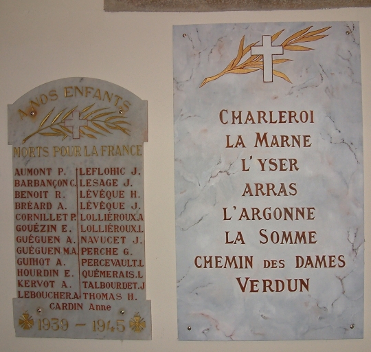 Sur l'autel est inscrit : "Aux enfants de Planguenoual morts pour la France 1914-1918". Trois plaques commémoratives avec les noms des soldats morts pour la France durant les deux guerres mondiales.