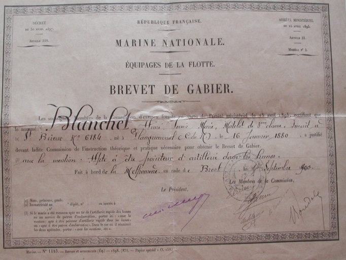 Ce coffre était la propriété de Louis-Marie Aymé Blanchet né le 16 juillet 1880 à Planguenoual et décédé la 4 mars 1961. Ce marin, formé à l'école des gabiers de la Marine Nationale, originaire du hameau de pêcheurs de la Cotentin, a embarqué la première fois au cabotage le 17 septembre 1894 sur le navire "Prosper Jeanne", puis au long cours, à la grande pêche (Terre-Neuve et Islande), enfin à la petite pêche côtière, en fin de carrière. Second capitaine sur les chalutiers de grande pêche "Sacha, Jeannette", il représente l'archétype des gens de mer, littoraux de la baie de Saint-Brieuc, nés de famille nombreuse, qui trouvaient un emploi dans la Marine auprès des armateurs du Légué ou des autres ports de la baie au cours de la 2e moitié du 20e siècle jusqu'au milieu du 20e siècle, avant le déclin de la grande pêche.