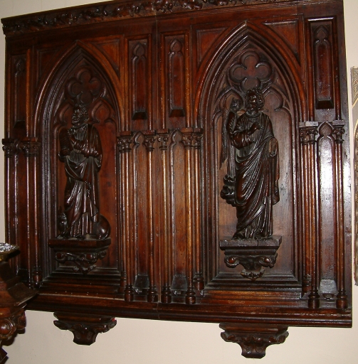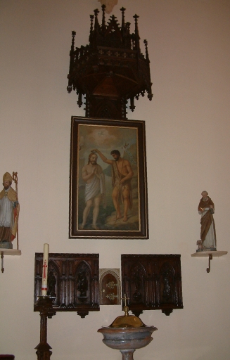 Deux panneaux de la cuve et l'abat-voix fixés sur le mur est du bras sud du transept.