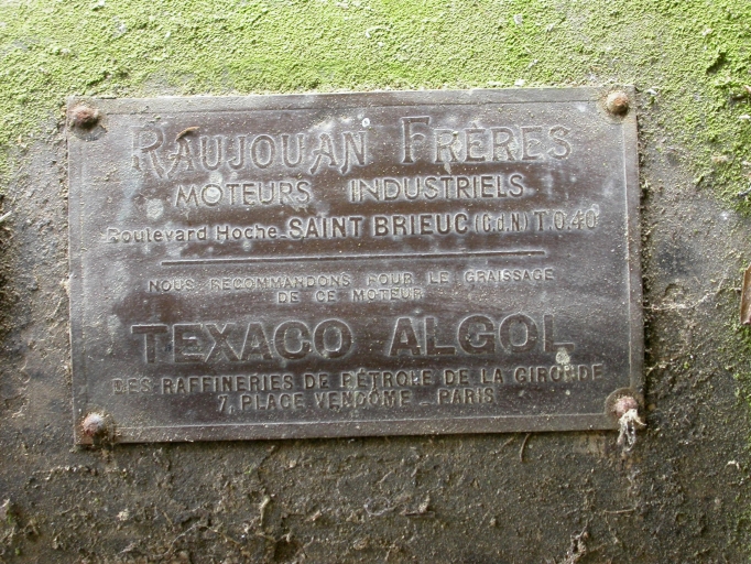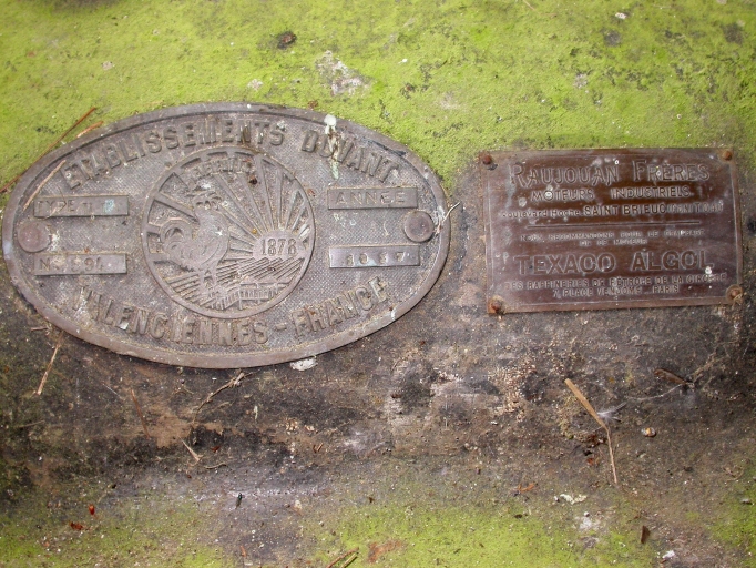 Inscription concernant le fabricant : Etablissements Duvant (1878). Valenciennes - France, année 1937. Inscription technique : Raujouan frères, moteurs industriels - boulevard Hoche, Saint-Brieuc (C.D.N.) TO 40. Nous recommandons pour le graissage de ce moteur Texaco Algol des raffineries de pétrole de la Gironde - 7, place Vendôme, Paris.
