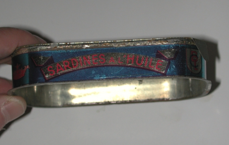 Boîte à sardines en fer blanc, soudée des deux côtés, qui s'ouvre par en-dessous. Longueur : 10, 6 cm et largeur : 7, 8 cm, pour une épaisseur de 2 cm. Inscriptions : Reines de la Manche ; Sardines à l'huile ; Poissons de 1ère fraîcheur ; Usine sur le lieu de pêche ; Conserverie de la baie de Lannion, ancien Ets. R. Collet 1881 ; Poids net 118g., contenance cubique : 25 cm3.