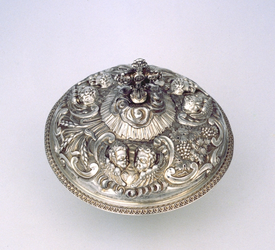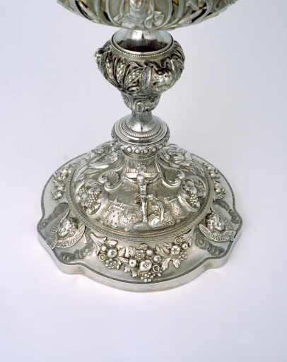 Ciboire en argent à coupe dorée et fausse-coupe ; le décor de têtes d'anges et du symbole blé, vigne, roseau se répète sur le couvercle, la fausse-coupe et le noeud ; le pied porte un décor figurant l'Agonie au Jardin des oliviers, la Crucifixion, le Portement de croix, sur un fond de ville et accompagné de vigne.