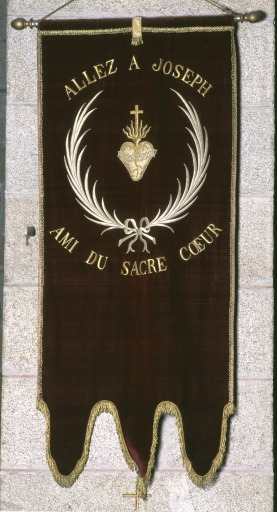Ensemble de bannières présentées dans la nef, accrochées aux piliers : paire de bannières du Saint-Sacrement, paire de bannières de saint Joseph, autres bannières de saint Joseph, trois bannières de la Vierge.