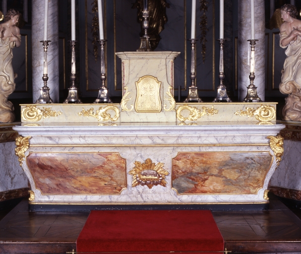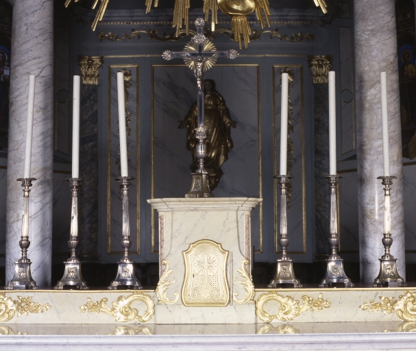 Maître autel à baldaquin à table en marbre, antependium galbé en bois peint faux marbre et peint doré (agneau mystique), tabernacle et gradins de même ; baldaquin de plan semi-circulaire à quatre colonnes en marbre à chapiteau corinthien peint doré portant un entablement peint faux marbre et peint doré interrompu par une nuée à rayons ; de part et d'autre de l'autel, deux statues d'anges adorateurs en plâtre polychrome et peint doré ; l'exposition du tabernacle est déposée et transformée en console placée à côté de l'autel.