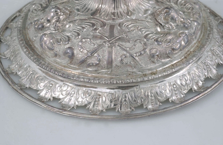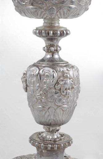 Poinçons (sur la coupe et la patène) : initiales L et R séparées par une hermine, surmontées de deux grains de remède et d'une fleur de lys, maître Louis Le Restif ; marque de Saint-Brieuc, 1697 : B couronné entre deux hermines, un soleil en pointe ; contremarque de Rennes : une couronne. Inscription : DONNE PAR MADAME PERRINE FRELONNIERE AUX DAMES RELIGIEUSES de MONCONTOUR (sous la base).