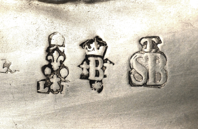 Poinçons (sous le pied) : initiales L et R séparées par une hermine, deux point et une fleur de lys surmontée d'une petite couronne d'où pendent deux glands au dessus, maître Louis Le Restif ; marque de Saint-Brieuc pour 1697 : B couronné encadré de deux hermines ; contremarque de Saint-Brieuc, vers 1697 : lettre S et B, petit T au dessus.