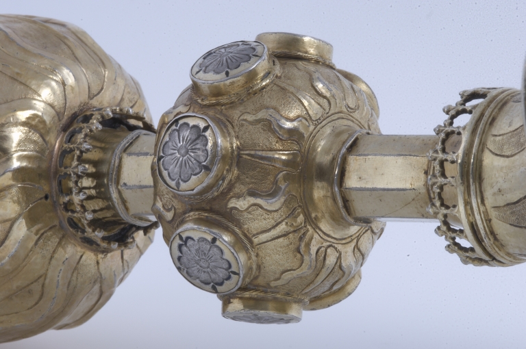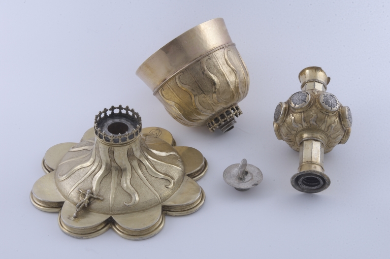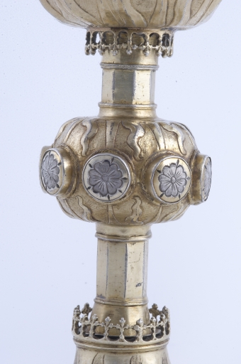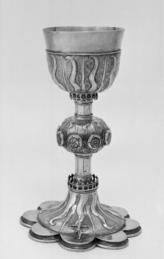 Bien que ne portant pas de poinçons, ce calice d´une belle qualité d´exécution présente le grand intérêt d´être daté, de 1594, par une inscription gravée sous le pied. Celle-ci fait état de la donation de l´objet par la fille de Charles Marot, riche dinannais appartenant à une famille qui compte à la fin du XVIe siècle plusieurs syndics de la ville ainsi qu´un sénéchal anobli par Henri IV en 1598. Les armoiries gravées sur le pied -une main dextre accompagnée d´une étoile- sont celles de cette famille bourgeoise en voie d´anoblissement qui eut un rôle de premier plan dans les fondations hospitalières de la ville entre le XVIe et le XVIIIe siècle. Les boutons du noeud gravés de quintefeuilles portant des traces d´émail, s´inscrivent encore dans la tradition gothique. Par contre, le décor de rayons et de flammes qui orne le pied, le noeud et la fausse coupe, présent sur les oeuvres rennaises du milieu du XVIe siècle, est encore employé à Paris à la fin du siècle, ainsi que le montre le calice de Fréhel, réalisé en 1597 par l´orfèvre parisien Jérôme Acher. L´emploi de couronnes ajourées au sommet du pied, inconnu à Paris, se retrouve dans les calices nantais de la même époque, ainsi que sur un calice de Corentin le Baron, orfèvre de Quimper, daté de 1583. Ici, de façon originale, la même couronne, inversée orne à la manière d´un lambrequin la partie inférieure de la fausse coupe.. Il convient de noter que ce calice se démonte entièrement à l´aide de pas de vis, celui qui se trouve sous le pied comportant une pièce soudée à l´équerre pour former clef. Ce principe rappelle celui de plusieurs calices de Basse Bretagne de la même époque, dont le pied pouvait éventuellement servir de support pour un ostensoir. C´est peut-être ici le cas de cet objet.
