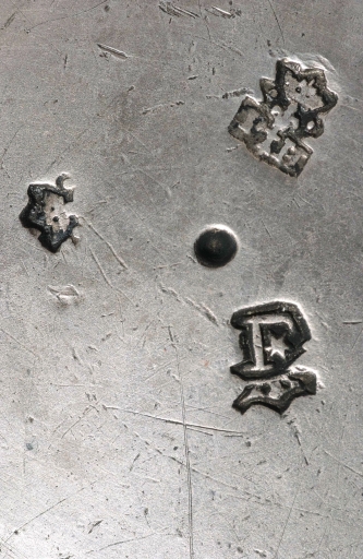 Poinçons (sous le pied de l'encensoir et de la navette) : initiales P H séparées par une hermine surmontée d'une fleur de lys couronnée, entre deux grains de remède, maître Pierre Hillion ; poinçon de Lamballe, vers 1730-1740, lettre L inversée, couronnée et flanquée à gauche d'une étoile à 5 branches. Inscription (gravée sur la prise de l'encensoir) : HENANSAL, 1740.