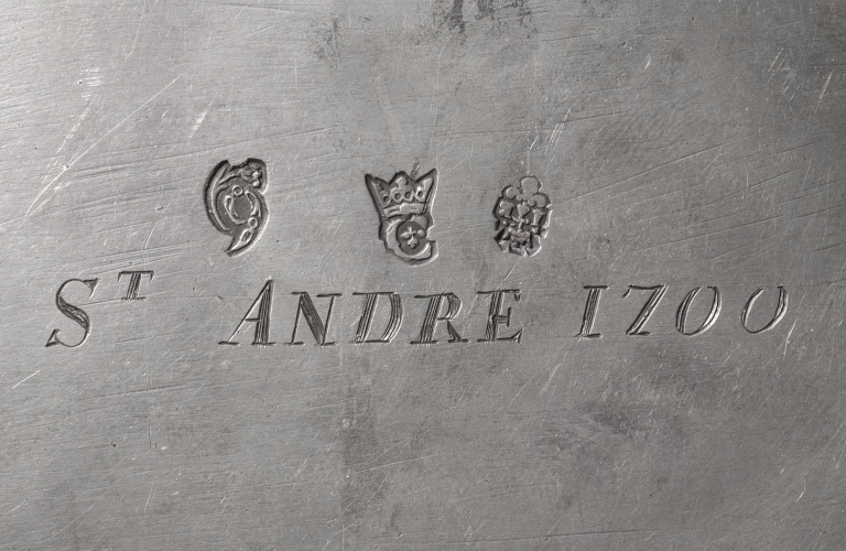 Poinçons (sur la tranche à la base du bras) : initiales I et B séparées par une hermine, motif trifolié au dessous, 2 grains de remède et une couronne au dessus, maître Jean Buchet ; communauté de rennes, 1698-1700, lettre C couronnée, une hermine dans l'oeil encadrée de deux points, un troisième point brochant sur la base de la couronne ; charge de Rennes : un 9 fleuronné d'où sort une tige courbe fleurie ; inscription gravée sous la base : ST ANDRE 1700 ; inscriptions dans la lunette : ST GONERY, ST MAGNUS MARTYR.