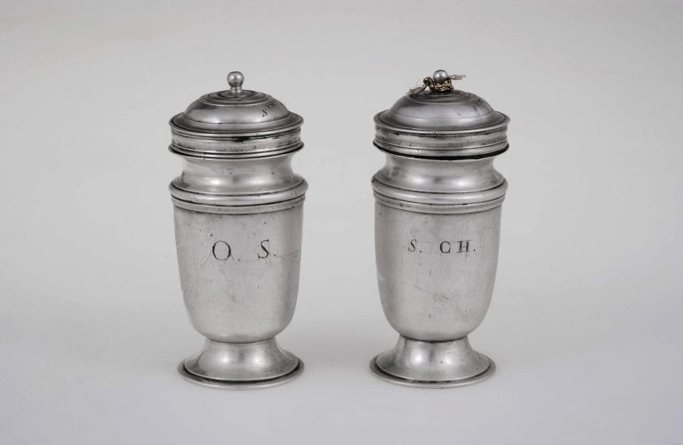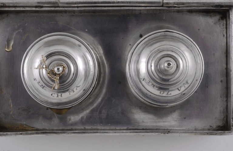 Très simple mais d'une exécution irréprochable, cet ensemble a le grand intérêt d'être resté complet. Le coffret est seulement renforcé en haut et en bas d'une moulure en talon, le couvercle, constitué de deux plaques mises en forme et soudées ne dispose pas de fermeture. Les ampoules à couvercle vissé, dont la forme en urne est pleinement Louis XIV, sont terminées par un étranglement permettant de mieux les sortir de leur logement. Leur décor à base de filets exécutés au tour est caractéristique de l'orfèvrerie simple du règne de Louis XIV.