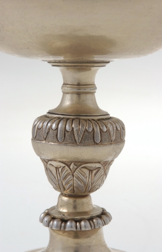 Cette pièce est représentative des oeuvres simples mais de bonne qualité réalisées pendant la première moitié du XVIIIe siècle. On y remarque le maintien d´un modèle globalement encore très XVIIe, qui s´écarte toutefois de ses références par quelques variantes de forme, de décor et d´exécution. La bordure du pied est très large, la cloche réduite, débordant par un encorbellement qui accentue le contraste, tandis que la tige, très discrète a perdu ses collerettes. La coupe est large, légèrement plus basse que sur les modèles du siècle antérieur et, surtout le couvercle s´est aplati. La bordure du pied, en large doucine reprend sans mise à jour le motif de la frise de feuillages estampés. L´examen de détail montre que, pour orner les écoinçons vacants entre les feuilles, l´orfèvre a utilisé un petit estampage en forme de godron qu´il devait par ailleurs employer pour orner des galons. Le décor ciselé qui orne le noeud et le sommet du couvercle est, selon la mode de l´époque détaché sur un bandeau mati. On a voulu voir dans cet objet une oeuvre des années 1730-1735 de l´orfèvre Louis Le Basteur installé à Fougères. Toutefois, l´étonnant poinçon à l´initiales V à pointe arrondie et chargée d´un point qui n´est probablement pas une lettre-date mais un poinçon du contrôle de la marque, pourrait fort bien plutôt s´appliquer à Vitré. Sachant que Louis Beaudoin, orfèvre dans cette ville y est, entre 1722 et 1726, commis aux contrôle des ouvrages et compte tenu de la qualité typographique du poinçon de maître qui comporte en outre quatre grains de remède au lieu des deux habituels, il semble plus cohérent de lui attribuer la paternité de l´oeuvre.