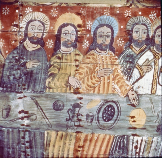 Peinture sur la voûte divisée en deux versants, chacun de deux registres.