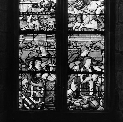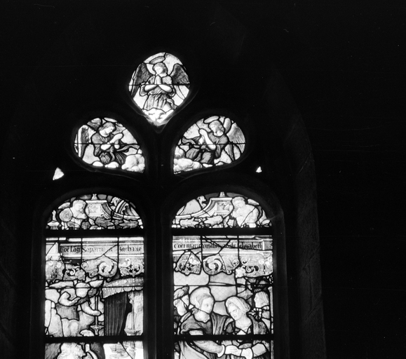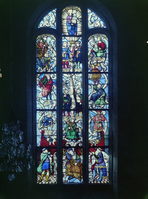 Vitrail de saint Mathurin divisé en deux lancettes comprenant chacune quatre panneaux. Vitrail de l'Arbre de Jessé divisé en trois lancettes. Vitrail de saint Jean-Baptiste divisé en deux lancettes décorées de dix scènes. Vitrail de sainte Barbe divisé en deux lancettes comprenant chacune quatre panneaux. Vitrail de saint Yves divisé en trois lancettes comprenant chacune trois scènes. Maîtresse-vitre comprenant une large bordure et un médaillon et cinq scènes réparties sur deux niveaux.