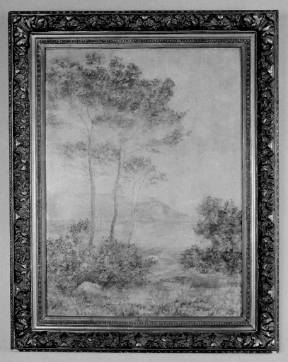 Au premier plan, nombreux arbres. Au second plan, paysage marin.