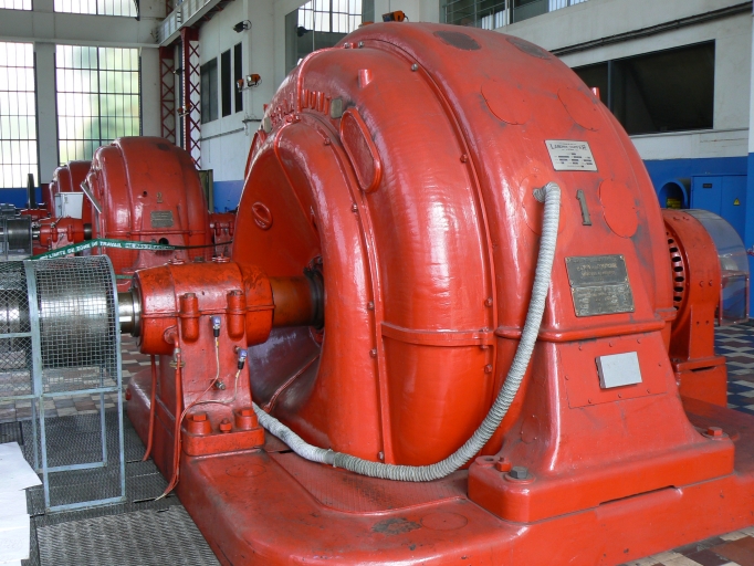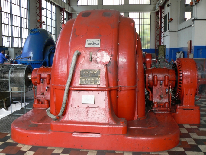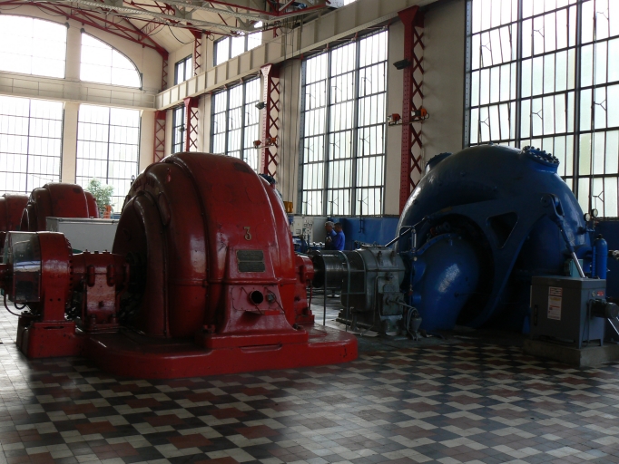 Cette unité de production d'énergie située dans la salle des machines est composée de trois turbines hydrauliques de type Francis associées chacune à un alternateur.