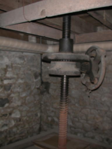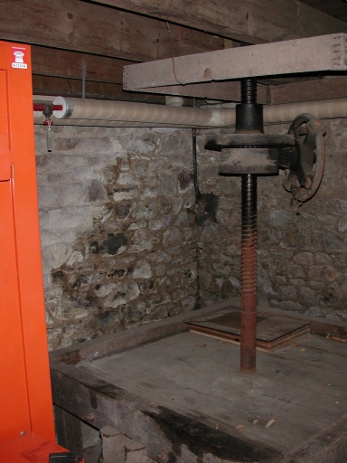 Le pressoir est constitué d'une plateforme en bois de 2 m de large sur 2 m de longueur, placé sur les plots, équipé de goulot d'évacuation ou dégorgeoir. Au milieu du pressoir, une vis sans fin et une caisse en forme d'entonnoir, reçoit les fruits à écraser. Le jus est ensuite déversé dans une auge en pierre sour le dégorgeoir.