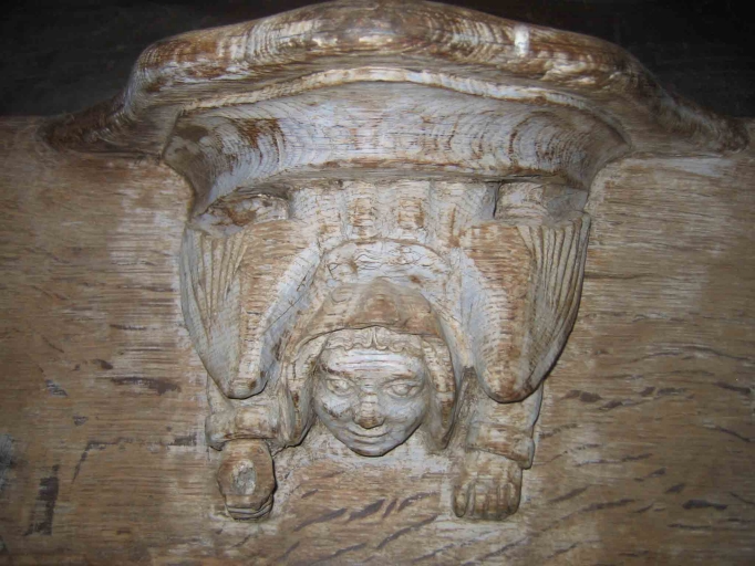 Sur la miséricorde : ange vu de dos à partir de la taille, sortant de la console de la miséricorde comme s'il descendait du ciel. Il est ailé, son visage est souriant, ses cheveux bouclés et il porte un capuchon ainsi qu'une tunique aux manches ourlées à leur extrémité. Sa main droite est serrée sur un objet qui a disparu.