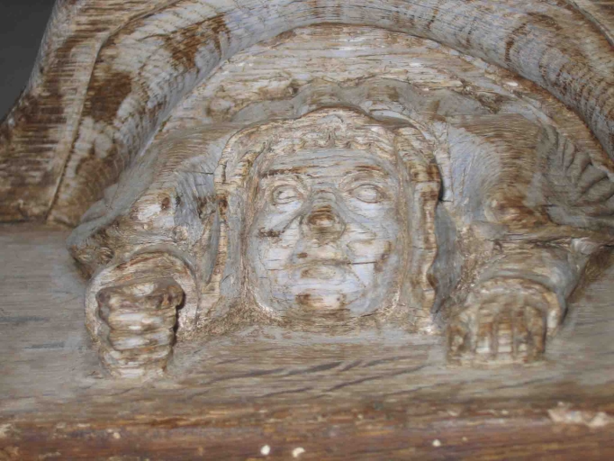 Traces d'insectes sur la partie basse de la stalle, parclose et appui-main recouverts d'un badigeon marron et épais.