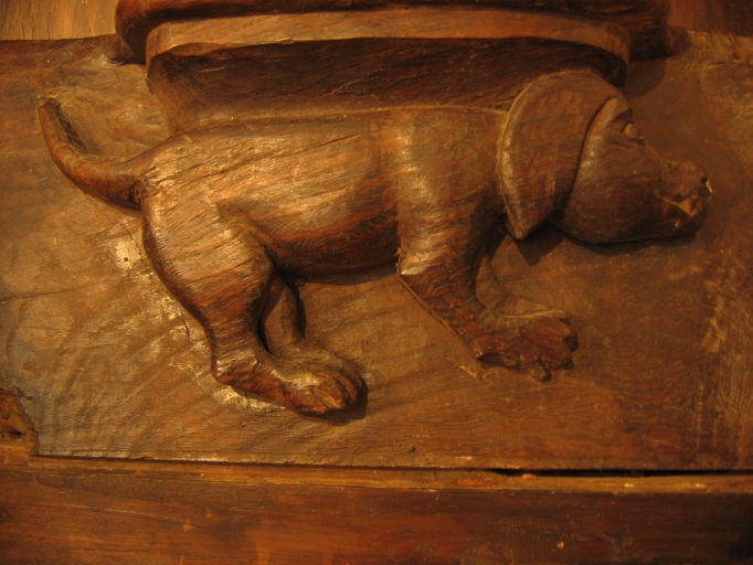 Sur la miséricorde : chien vu de profil et tourné vers la droite de la miséricorde. Le corps est massif, les oreilles longues, tombantes et pointues. Sa gueule est plutôt celle d'un porc avec des joues importantes et le museau relevé. Néanmoins, il montre les dents comme s'il grognait et ses pattes sont pourvues de doigts et non de sabots. Il possède en outre une queue.