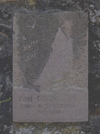Plaque commémorative, réalisée en granite, avec la dédicace gravée suivante, à côté du dessin sculptée d'un bateau sous voiles : A notre ami : Paul Cornillet, patron du St-Guénolé (1923-1988). La plaque taillée et sculpté e granite rose mesure 60 cm de hauteur et 40 cm de largeur.