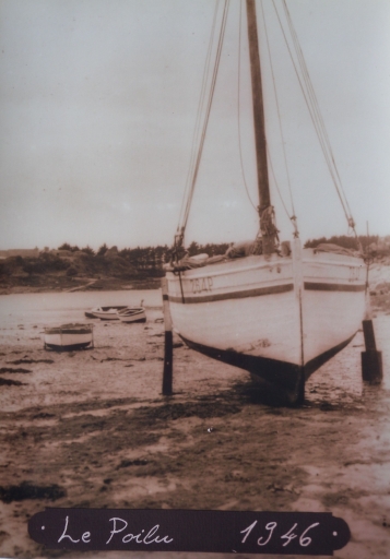Le bateau 'Le Poilu' a été construit dans un chantier naval de Locquémeau en 1920 (Collet, Landouar, Levier ?) ou de la côte trégorroise (Kegariou ?), sur les formes des canots de Carantec ou des bateaux goémoniers de Locquémeau, d'abord pour le pilotage et ensuite la pêche côtière. Nous avons trouvé la trace (témoignage oral) d'un certain Kervarec ou Kermarrec de Trébeurden qui aurait armé un bateau de pêche, dénommé 'Le Poilu'. Ce nom lui aurait été attribué par un 'ancien poilu', soldat de la Guerre 1914-1918 (témoignage de Charles Le Bideau de Bréhat, recueilli par Nicolas Pluet). Les frères Le Hénaff Marcel et Arthur de Lannion auraient aussi armé un bateau avec ce même patronyme, avant d'armer le 'Bélouga', gréé en lougre-flambart pour la pêche à la sardine. Son premier propriétaire serait un certain Le Hénaff de Lannion, qui l'arma à la pêche à la sardine, à la collecte du sable et au pilotage à Lannion, avec le gréement de flambart, avant de le vendre à un marin de Pleubian en 1944, François Croajou (ancien 'Poilu' de la guerre 14-18 à la retraite, qui lui donna son nom). Il fit rectifier sa quille pour faire le goémon, au scoubidou manuel, (vendu aux cultivateurs). Les varangues et l'étambot furent aussi changés pour diminuer le tirant d'eau arrière. Il modifia son gréement en cotre aurique (en bocq), l'équipa d'un moteur fixe de 4 cv, sans embrayage (et lui rajouta un petit poste avant, avec un pontage au tiers devant le mât. Jean Kerleau, charpentier de marine de Lanmodez a refait le pont avant que le bateau ne soit de nouveau vendu. En 1946, le bateau changea de nouveau de propriétaire et est revendu à Charles Le Bideau, marin pêcheur, originaire de Pleubian, pour la drague aux praires dans le Ferless (en 1954), le goémon, les casiers à homards en été, les filets à araignées et les lignes autour des îles de Bréhat. Il naviguait encore à la voile avec le moteur auxiliaire. C'est à cette époque qu'il a été bordé d'un soufflage à l'extérieur et d'une sous drague sous la quille pour pratiquer la pêche aux casiers. Pour la drague des praires, Charles Le Bideau avait utilisé en guise de treuil, un pédalier de vélo avec une chaîne. Le bateau de petite pêche côtière a pratiqué 8 métiers différents entre la baie de Lannion et la baie de Paimpol entre 1920 et 1976. C'est le canot creux polyvalent par excellence, typique des bateaux de pêche de la Bretagne Nord. Il a navigué à la voile jusqu'en 1959. A l'origine, il était équipé d'un gréement de flambart avec cependant moins de quête que les flambarts sardiniers de Loquémeau. Il a terminé sa carrière à l'Île de Bréhat comme bateau de pêche et de charge, vendu à Jean-Pierre Prigent de Bréhat en 1960, pour le transport des galets et le goémon (pour l'usine de Pleubian). Il a enfin été revendu en plaisance pour le Club Nautique de Bréhat. Cependant, le mauvais état de la coque (passavants) ne permit pas la restauration dont il avait besoin. Le bateau resta sur une grève à l'état d'épave. Il a été inventorié une première fois en 1992 dans le cadre de l'inventaire du patrimoine naval de la Bretagne (SRI). Néanmoins, un relevé de ses formes a pu être effectué par un charpentier de marine Nicolas Pluet en 1993 pour une reconstruction à l'identique.