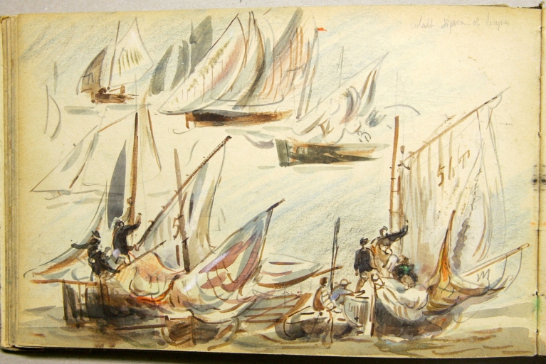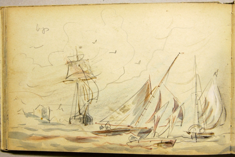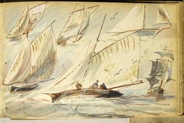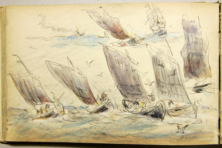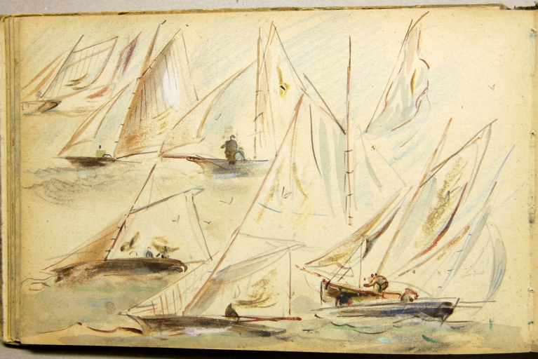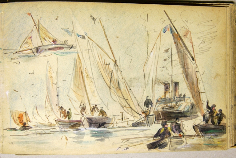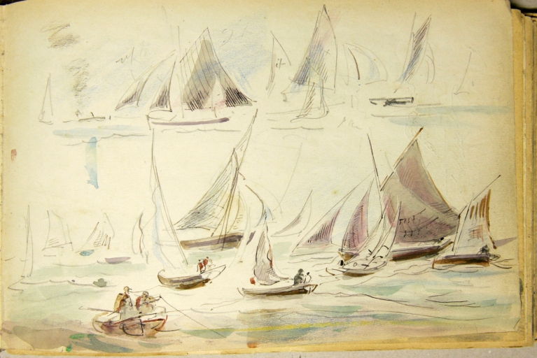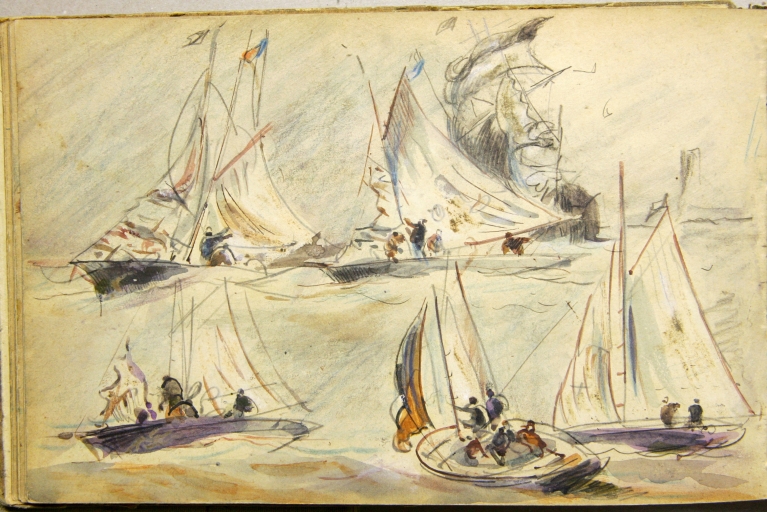 Le peintre douanier Louis-Marie Faudacq (1840-1916) est l'un des témoins de la diffusion de la plaisance en Bretagne. En 1854 est créée la Société nautique de Paimpol, organisatrice de nombreuses régates., illustrées par Faudacq, dés son affectation comme douanier à Lézardrieux en mai 1868, commune proche de Paimpol. Faudacq a collaboré à la revue le 'Yacht', créée en 1878, illustrant : le départ des régates de Paimpol le 29 août 1886 et en 1889, celles du 25 août, avec les bateaux de pêche se préparant pour la course. En effet, les bateaux de pêche et les yachts participaient à ces régates estivales dans des catégories différentes. L'un des carnets de Faudacq, qui porte l'inscription 'Régates', présente de nombreux dessins aquarellés des régates de Paimpol. Ce carnet peut être daté du 4ème quart du 19ème siècle. Une partie seulement de ces dessins a été sélectionnée et reproduite. Les dessins de Faudacq sont conservés en partie au Musée de St-Brieuc et dans des collections particulières.