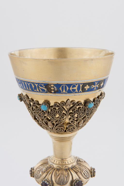 Le pied hexalobé se termine par une frise de feuilles lobées ajourées. L’orfèvre s’inspire de la mode parisienne des années 1620-1630 qui affirme l’utilisation du pied circulaire s’achevant par une frise de feuilles d’acanthe ajourées. Les arêtes du pied alternent entre cabochons de grenats et inclusions d’émaux. La silhouette aplatie du nœud reprend les formes des calices des XIVème et XVème siècles. Le nœud est orné de boutons saillants dans lesquels viennent s’insérer des améthystes. Il est également décoré de motifs végétaux tels que l’épi de blé et la grappe de raisin. Ces motifs eucharistiques se retrouvent par ailleurs sur la fausse-coupe. Cette dernière accueille des cabochons de turquoises.Les arêtes du pied comportent des cloisons quadrilobées dans lesquelles viennent s’insérer des émaux. Trois saints sont représentés : saint Jean tenant un calice au-dessus duquel plane une hostie, saint Paul portant une épée instrument de son supplice ainsi qu’un livre et saint Pierre tenant les clés du royaume des cieux qu’il a reçues du Christ.Sur ce calice, la technique du faux-filigrané est utilisée sur le pied et la fausse-coupe. Ce décor imite le filigrané faisant référence aux calices du XIVème siècle. Au XIXème siècle la technique du faux-filigrané est utilisée en orfèvrerie religieuse pour des motifs de volutes, de postes et contre-postes et de palmes.