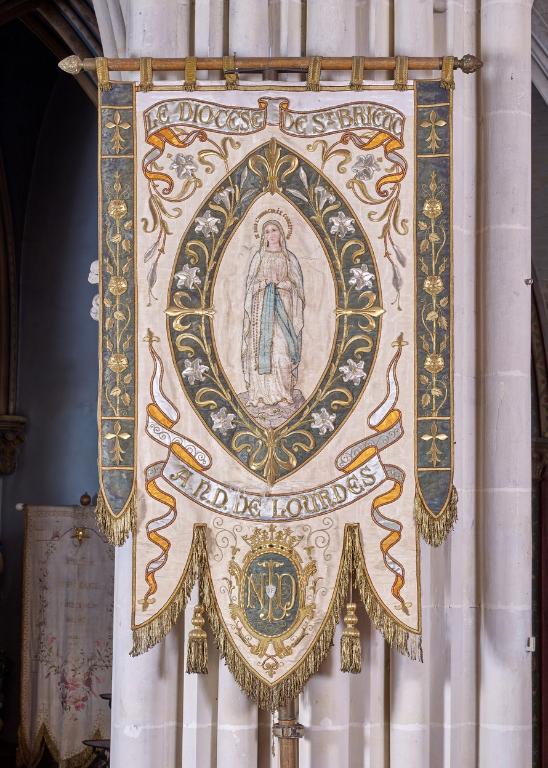 Commandée par l'archiconfrérie de Notre-Dame d'Espérance, cette bannière est sans doute destinée à être processionnée lors des pèlerinages à Lourdes et à y représenter le diocèse de Saint-Brieuc.