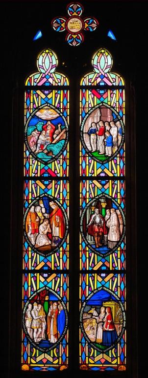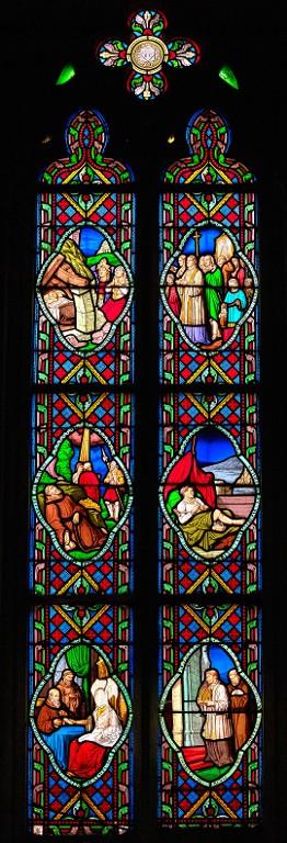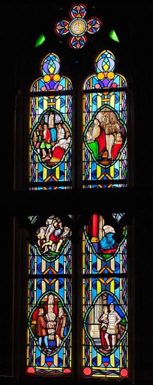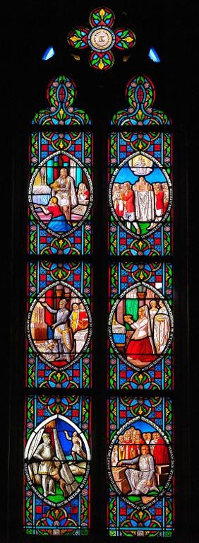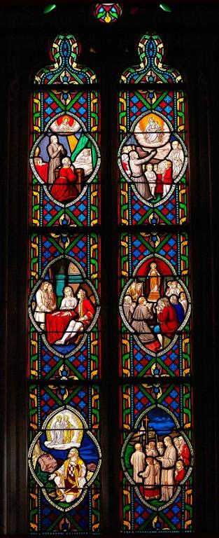 Commandés au moment de l'achèvement des travaux de l'édifice et exécutés entre 1855 et 1862, dans l'atelier du Carmel du Mans, par les peintres-verriers allemands Carl et Frédéric Küchelbecker, ces 33 verrières sont considérées comme "le point de départ de la renaissance de l'art du vitrail dans le département des Côtes-du-Nord" (C. Douard, 1982). Ce sont en effet les plus anciens vitraux historiés repérés pour le 19e siècle.