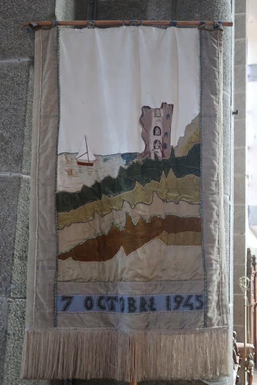 Offerte en guise d'ex-voto, la bannière célèbre le retour des soldats et des prisonniers de la seconde guerre mondiale. Elle est processionnée pour la première fois lors de la procession du vœu d'octobre 1945.