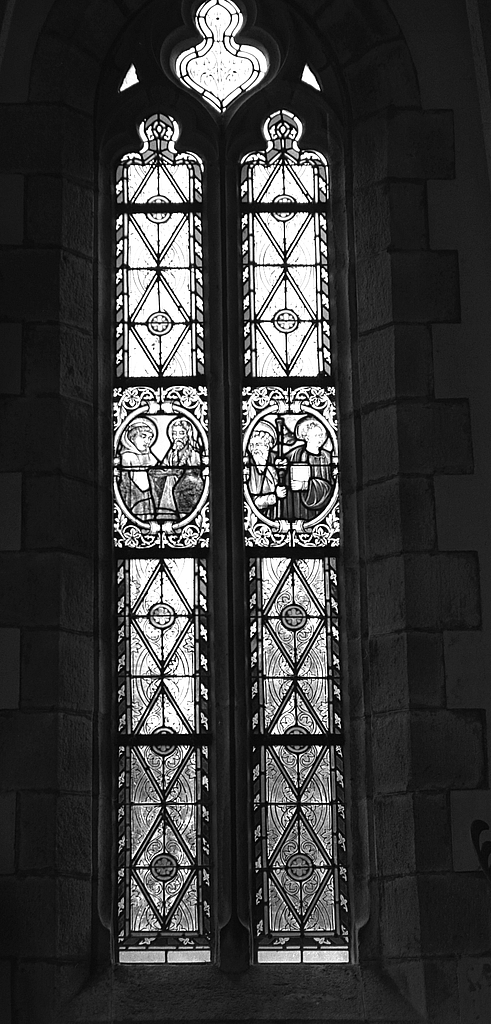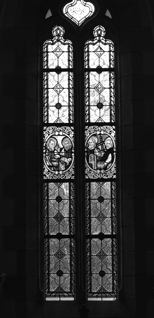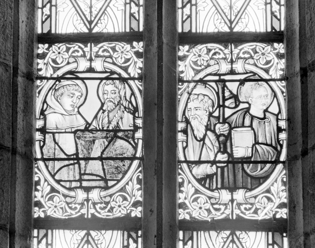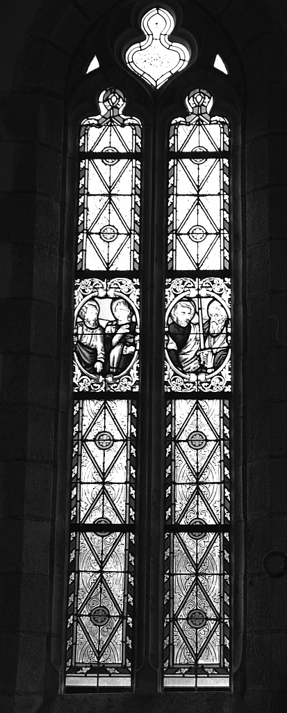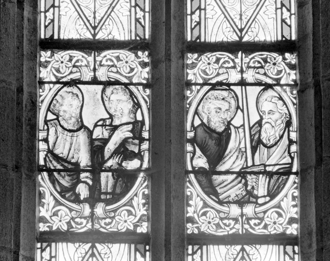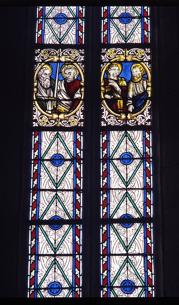 Verrière (3) : apôtres et saints (1 (2), 3), verrière à personnages, église paroissiale Saint-Justin (Guiler-sur-Goyen),